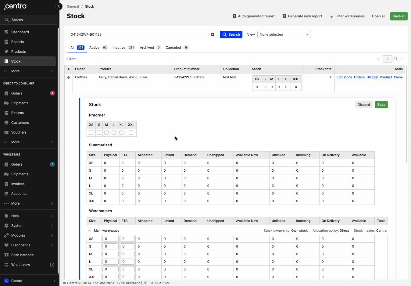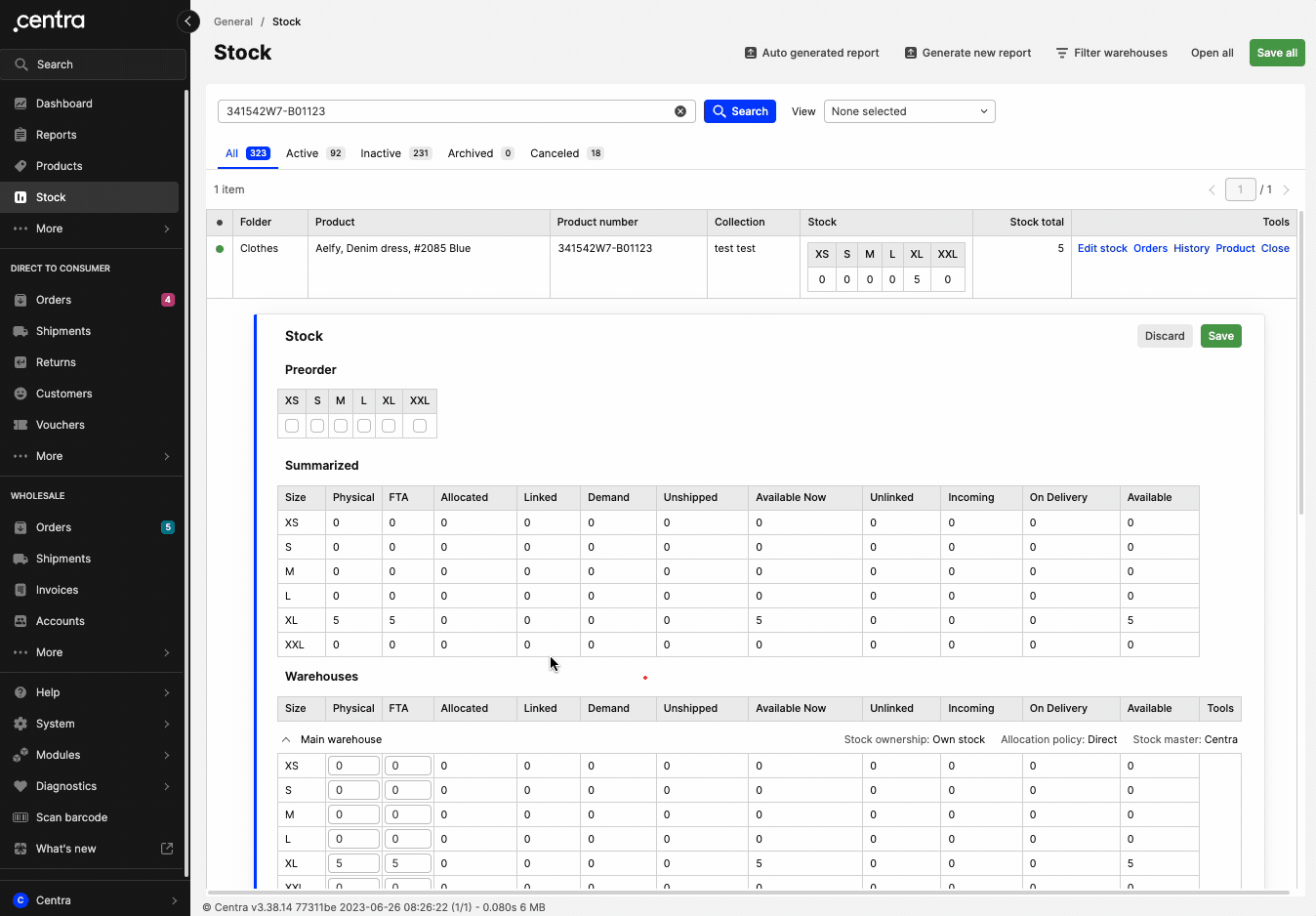 - Editing stock levels in the Stock View is done using the principle of setting new stock levels. In the Warehouses section, the fields for Physical and FTA values can be edited. Example: If your current stock level for a certain product is 7 pcs in size XS but you would like to change that to 10 pcs, you simply do so by typing 10 in the XS field in the respective warehouse. More scenarios are described in the section below.
