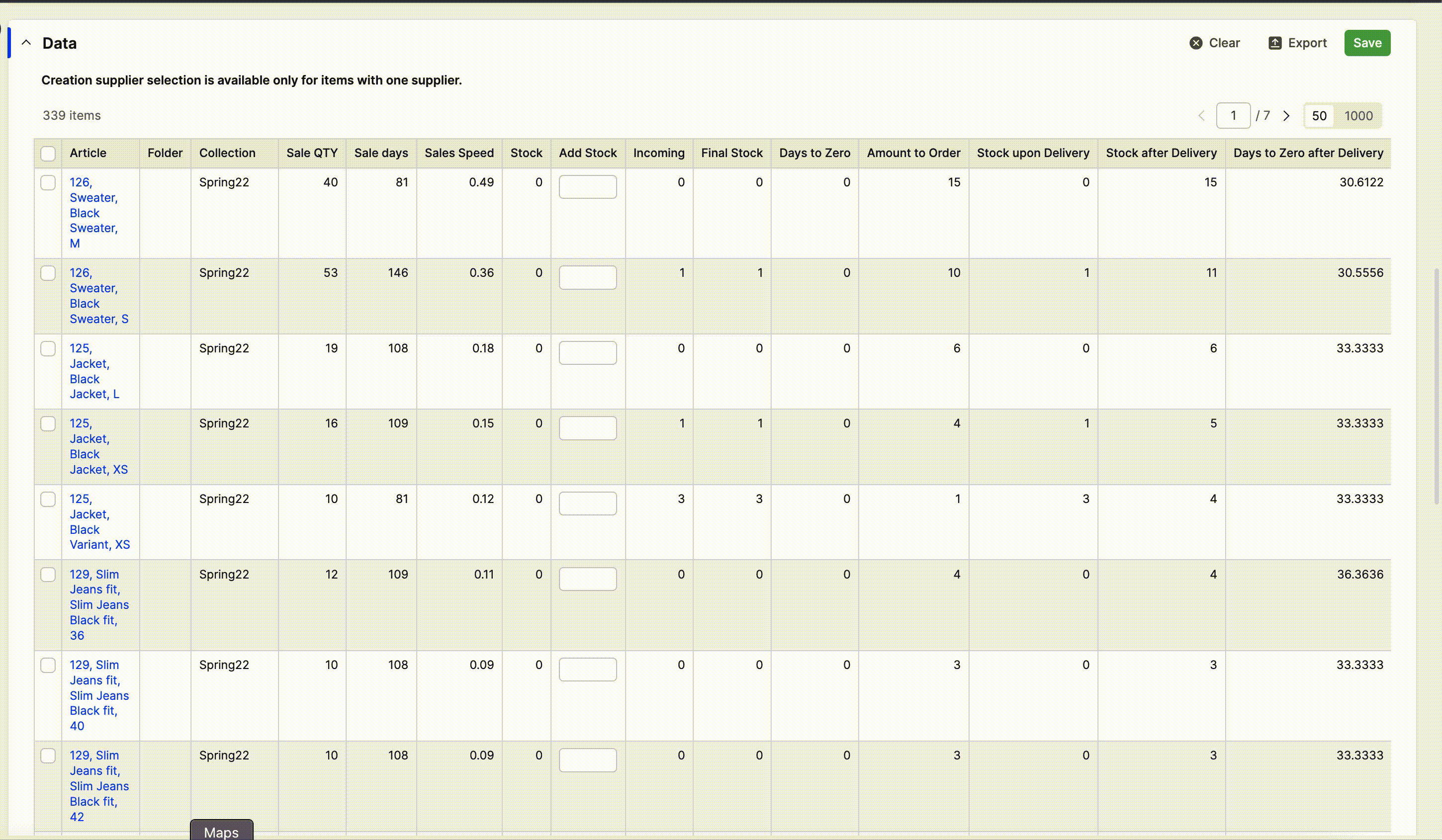 We recommend that you export the report and play around with it in Excel as the parameters are there and you can easily see what will happen to the stock and sale speed if you just change some small numbers here and there. Note that the export will include all products in the product catalog that have a size.