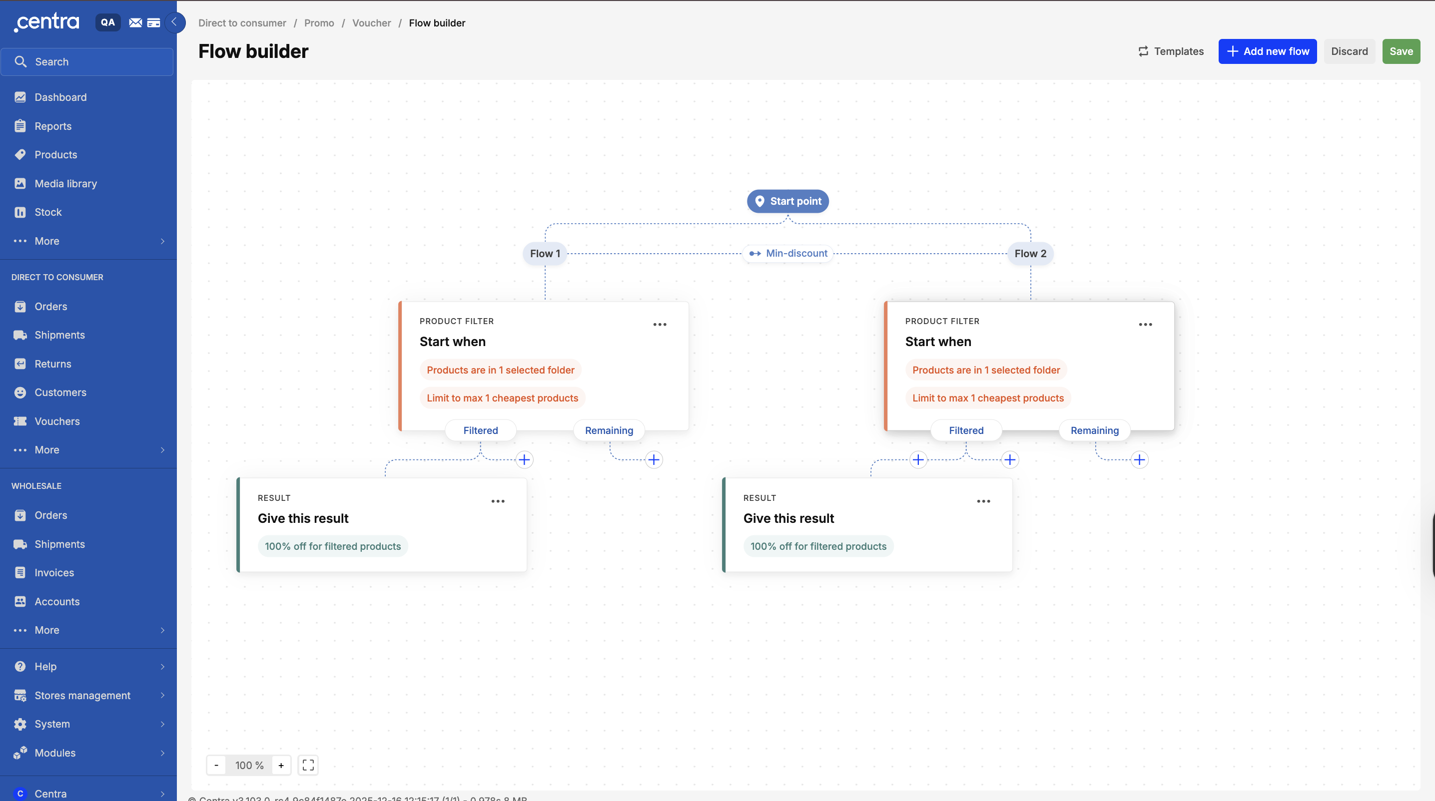 This template uses the Max-discount flow. Centra applies the flow that provides the highest discount for the customer.