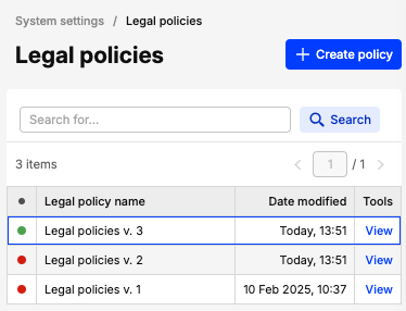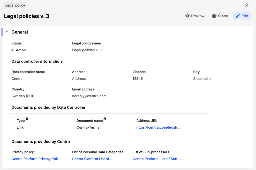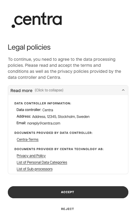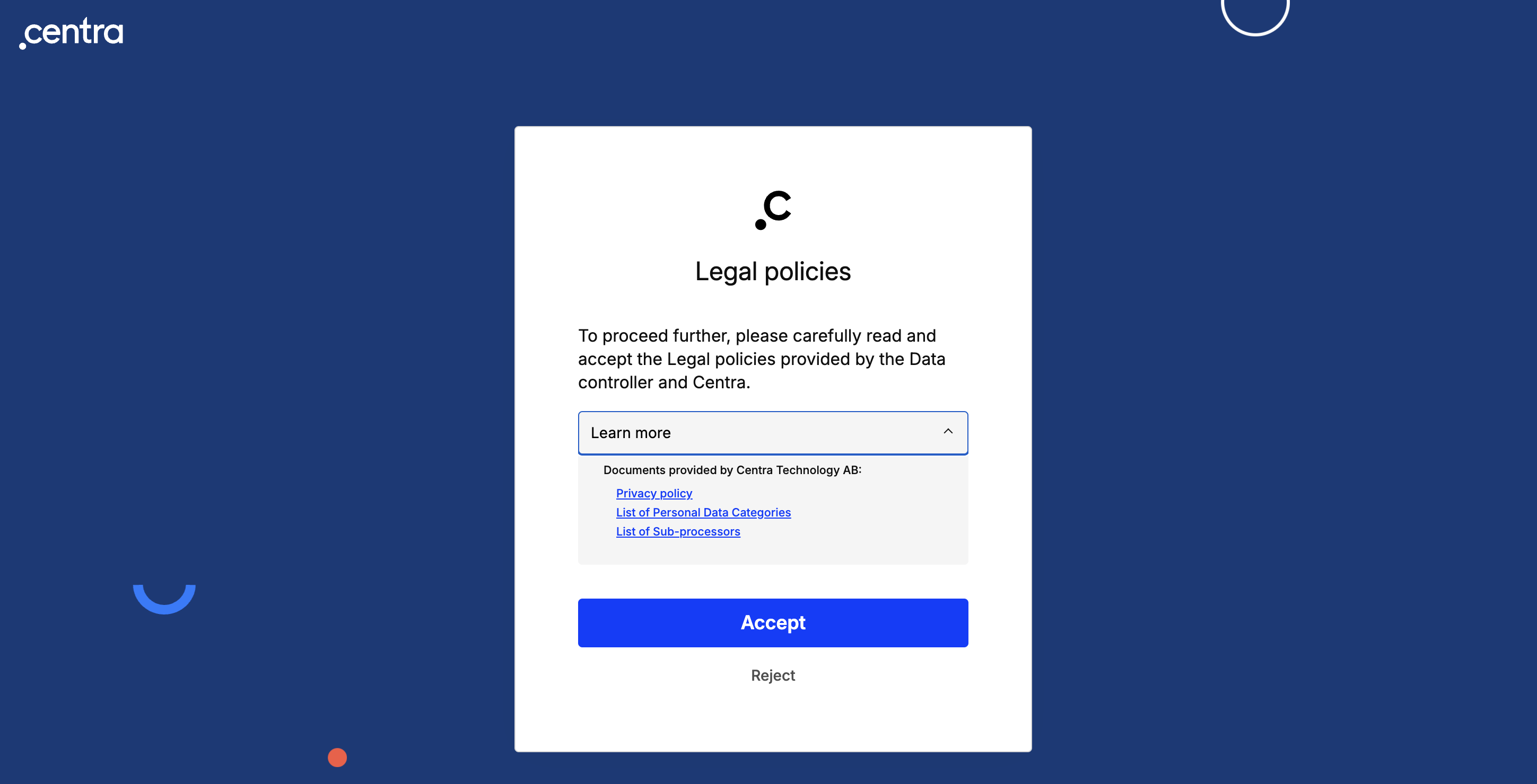 Legal policies in Centra are a collection of documents that must be accepted by users.