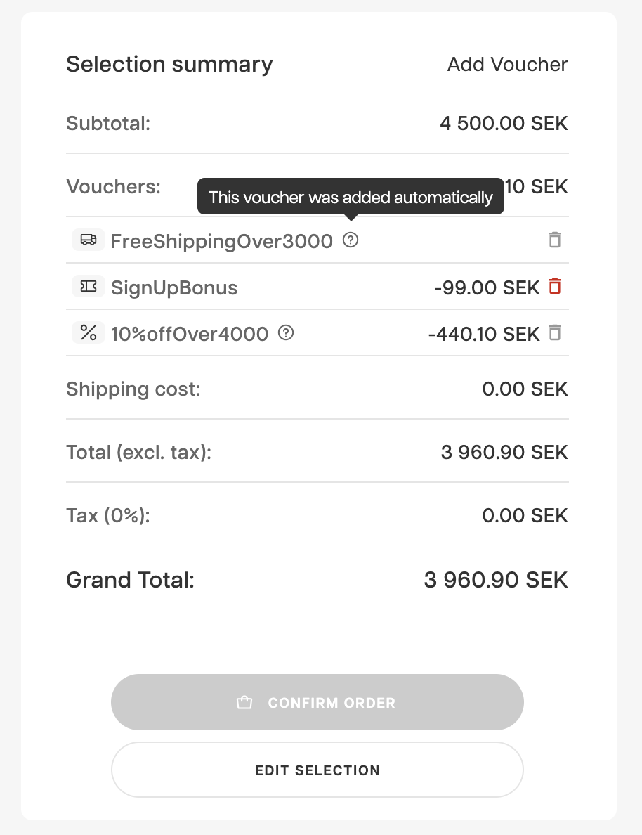 will be displayed in the checkout summary, this includes auto-vouchers - make it short and sweet! - Auto-vouchers are clearly visible to the buyer, but not possible to remove
