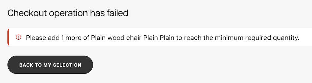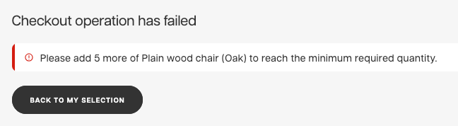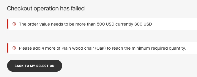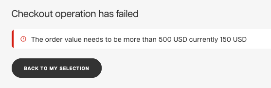 If the conditions of the minimum order is not fulfilled, the checkout will fail and it will show you this kind of message in the Showroom: