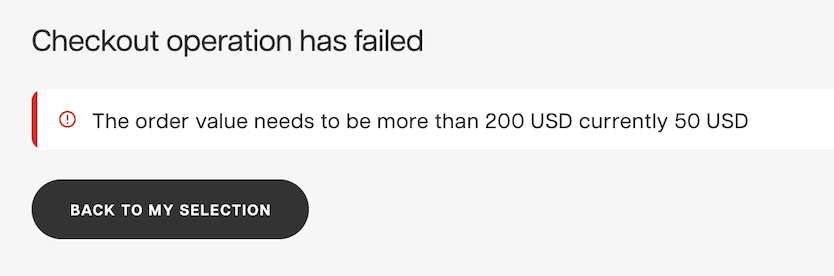 If the condition of when the minimum order amount is not fulfilled, the checkout will fail and it will show you this kind of message in the Showroom: