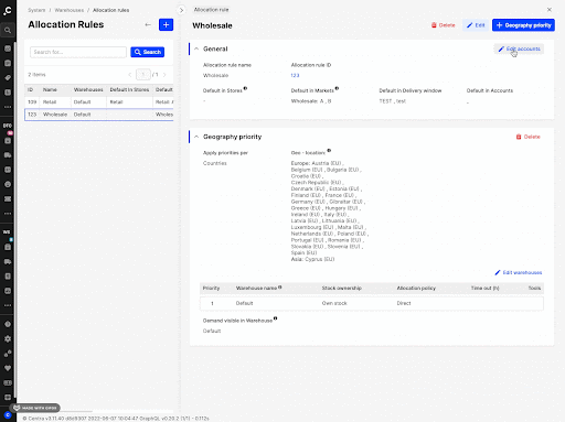 Staying on the same example of the Allocation rules (System > Warehouses > Allocation rules), we can also look at the other subcategory, where both Global edit and section specific edit button are needed. Focusing on the second section of a selected Allocation rule, we can see that the second section is called “Geography priority”. The “Edit warehouses” button can be used to add or remove warehouses in this section. However, once a warehouse is added, the priority of the warehouses needs to be edited within the listed table. For this to happen, the Global edit on the Details top bar needs to be used. See these actions executed below:
