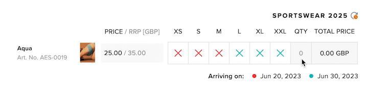 By hovering over a specific cell, you can view the ETA for that specific size. The colors of the cross icons match the legend below the matrix. Remember that if a product is added to multiple supplier orders/deliveries, the nearest date is displayed in the matrix.