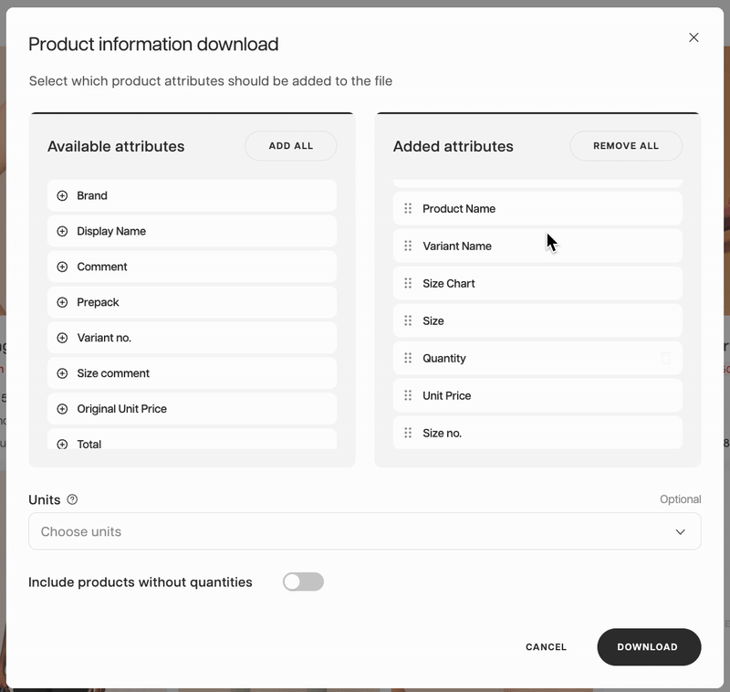 The Sales Representatives or Administrators can add any available fields set up from the Export fields in the Centra backend. Sellers can add, re-order, or remove attributes for that download.